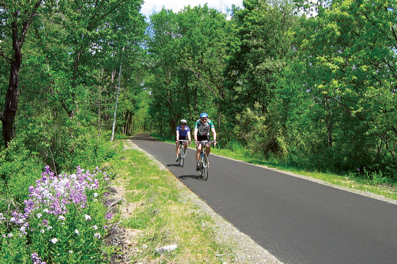 Just over the border in New York, a paved path that currently extends north from the hamlet of Wassaic to Copake Falls. Eventually, it will total 46 miles and end in the town of Chatham. Parking is available at numerous places along its path, making it easy for sections to be walked or biked.